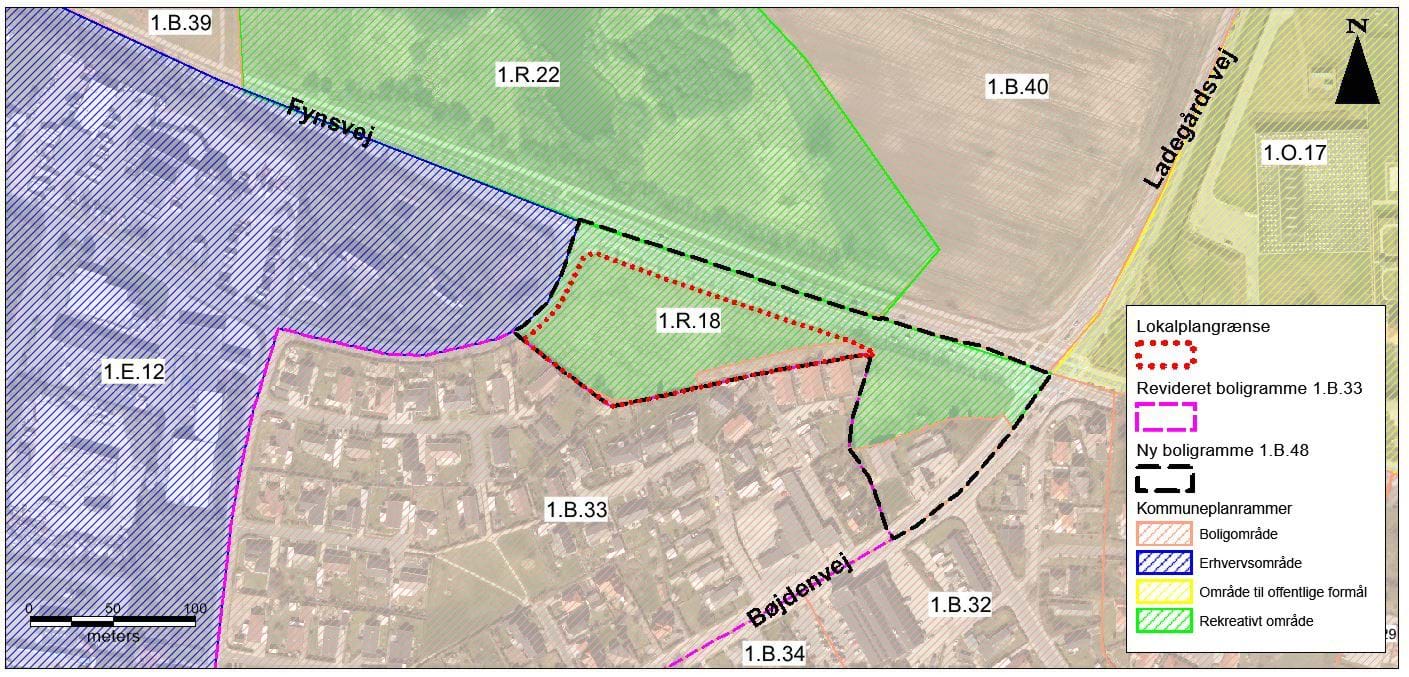 Figur 1: Gældende rammeområder i Kommuneplan 2017 farvekodet efter planlagt anvendelse. På kortet er de foreslåede afgrænsninger af ramme 1.B.33 og den nye boligramme 1.B.48 vist. Ramme 1.R.18 foreslås aflyst helt. Med rødt af vist afgrænsningen af lokalplanområdet.