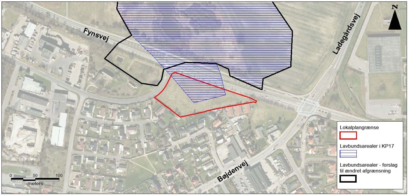 Det er derfor Nyborg Kommunes vurdering, at afgrænsningen af lavbundsarealet kan revideres for at muliggøre byggeri på grunden. Den samlede udpegning af lavbundsarealer må imidlertid ikke formindskes, jf. Oversigt over nationale interesser i kommuneplanlægning. Med dette tillæg flyttes udpegningen til at omfatte et areal, der reelt fungerer som et lavbundsareal, nemlig Nyborg Forsyning og Services regnvandsbassin på nabogrunden, matr. nr. 15dq af Vindinge by, Vindinge.