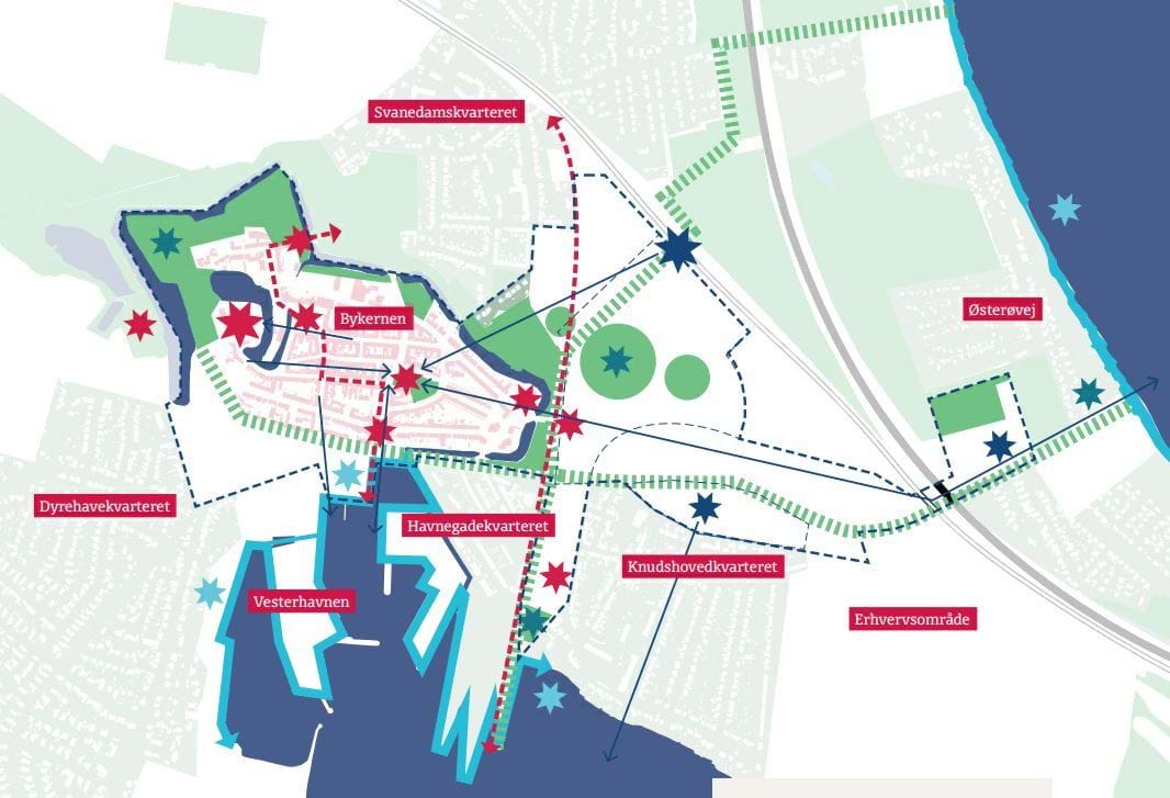 Området indgår i den strategiske udviklingsplan for Nyborg – ”En samlet by”, og er tænkt som lokalt mødested og rekreativt areal for beboerne i de nuværende og kommende boliger i området. Plangrundlaget skal derudover være med til at styrke forbindelsen mellem by og havn og skabe forbindelse på tværs. Endelig er det vigtigt, at stedets kulturhistoriske fortælling, som tidligere jernbanefærgehavn, fortsat kan aflæses i områdets udformning og indretning. Se illustrationskort fra udviklingsplanen herunder.
