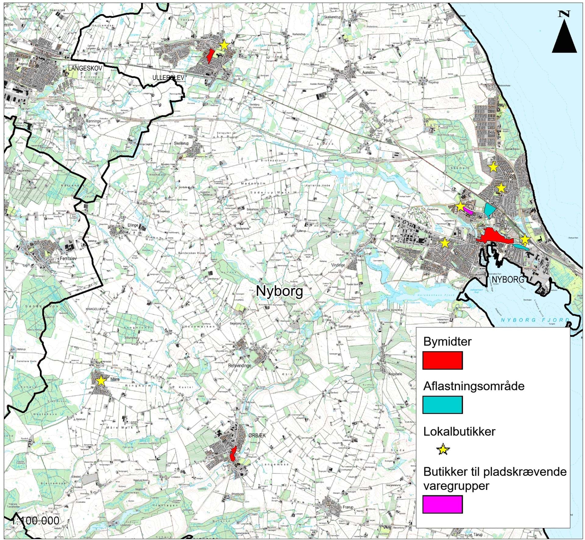 - Detailhandelsstrukturen i Nyborg Kommune fastlægges efter principperne i bymønstret, dvs. med Nyborg som hovedcentret og med lokalcentre i Ørbæk og Ullerslev.