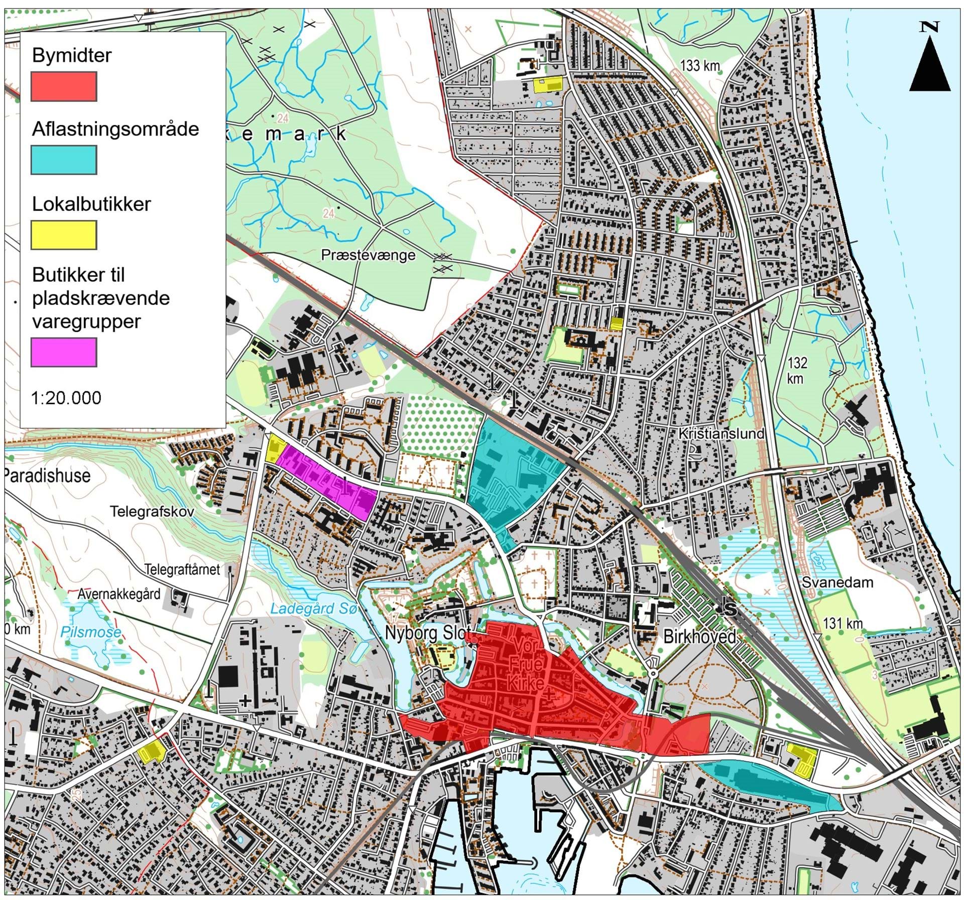 - Nyborgs bymidte afgrænses med udgangspunkt i den historiske bymidtes handels- og servicefunktioner. Bymidtens vækstretning er mod øst så der sikres en sammenhæng med udviklingsområderne ved Nyborg Station, Svanedammen , de nye områder på færgelejerne og byomdannelsesområderne ved Storebæltsvej.