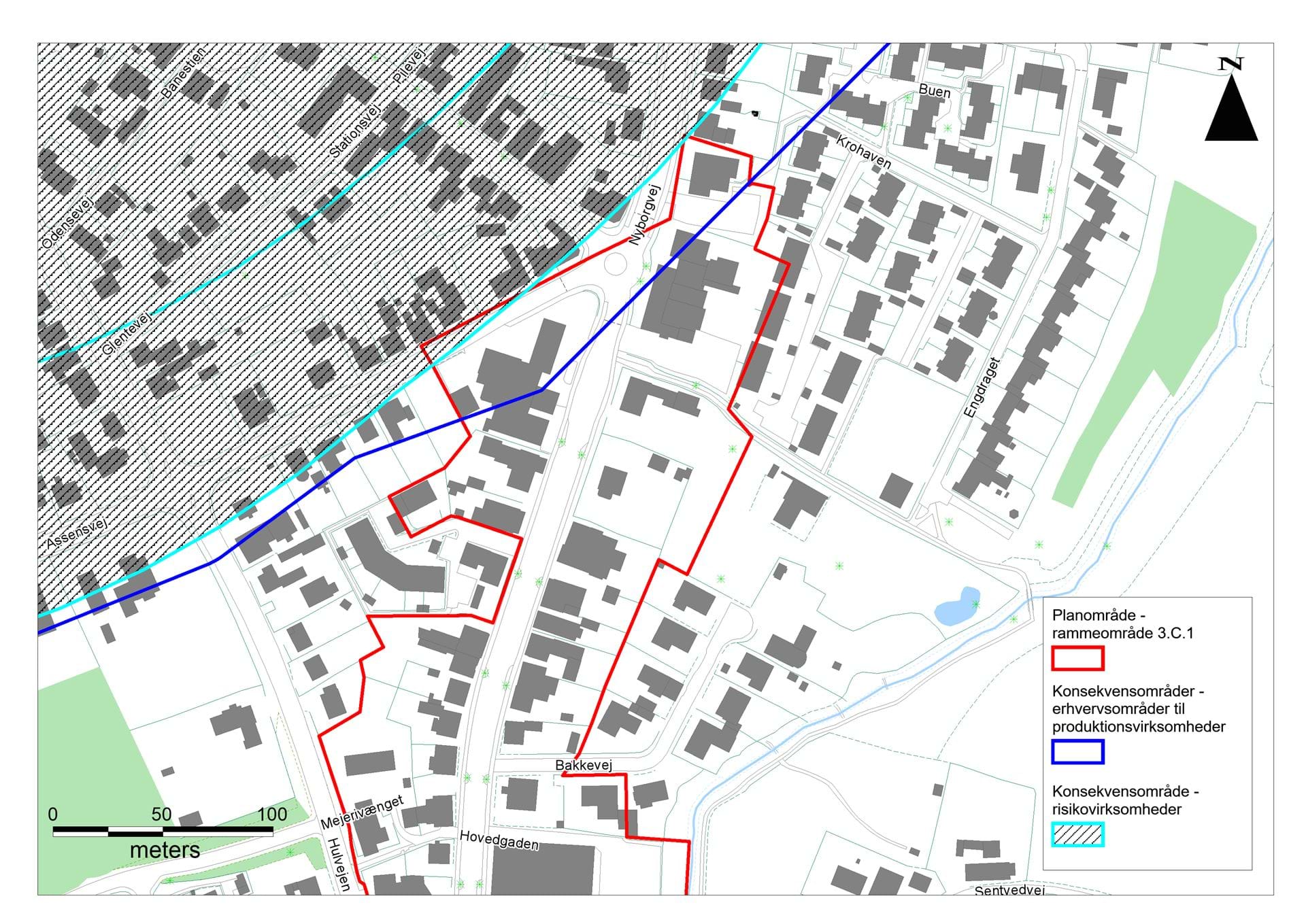 Figur: Konsekvensområder omkring et erhvervsområde forbeholdt produktionsvirksomheder og omkring risikovirksomheder sammenholdt med planområdet (rammeområde 3.C.1).